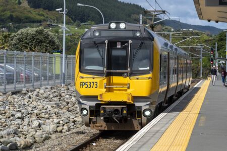 Waikanae New Zealand November 1 2019. At the Waikanae train station an electric rail car arrives and departs travelling to Wellington city.