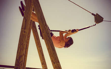 Adult freedom woman having fun on zipline, descend on rope, cable aerial ropeslide. Happiness and carefree.