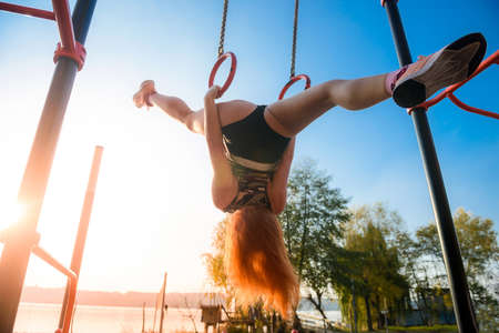 The sportsman performing difficult exercises on on stationary rings, sports gymnastics