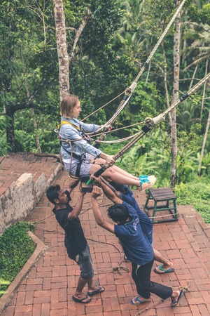 BALI, INDONESIA - JANUARY 23, 2018: Woman swings in the deep jungle. Bali island.
