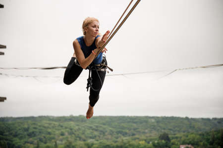 Fearless blonde girl balancing high on a slackline against the grey sky on rainy summer day