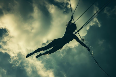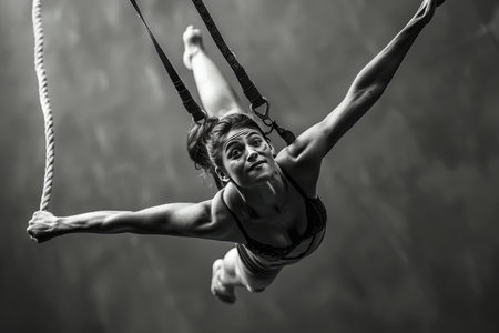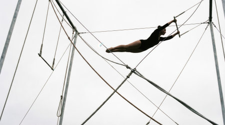A graceful trapeze artist soaring through the air --ar 3:2 Job ID: 6e5e4fed-feeb-42cc-bb55-b1d9084d3c22