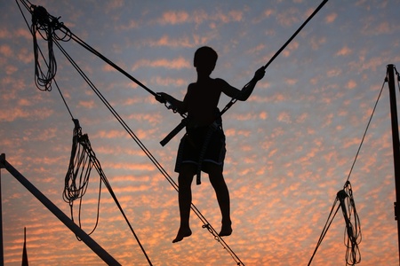 kid having swing on a high flying trapeze, boy learning acrobatic