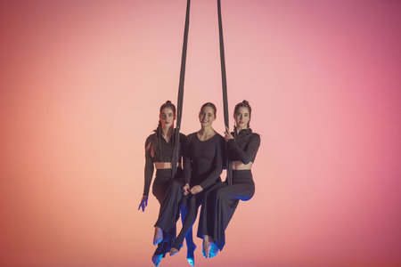 Trio of young female acrobats posing sitting on aerial trapeze. Aerial gymnasts perform in studio with pink light. Circus show concept.