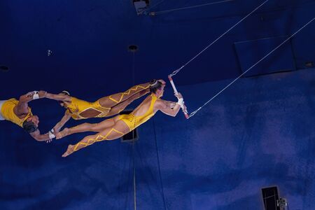 Belarus, Gomil, February 16, 2019. State Circus. Program Bravo Bravissimo. Aerial acrobat performs a circus trick. Gymnast under the circus dome