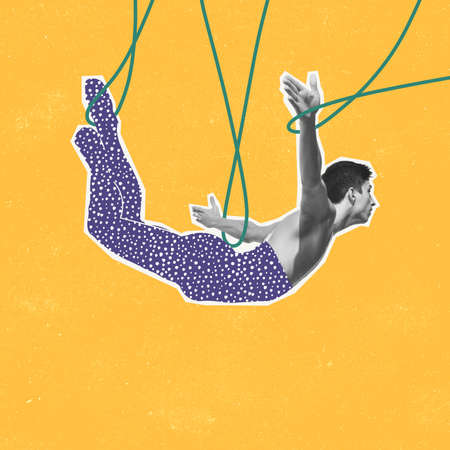 Contemporary art collage. Inspiration, idea, trendy magazine style. Sport. Professional male aerialist isolated on yellow background with drawings.