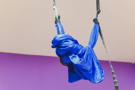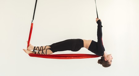 Tender fit young woman doing fly yoga stretching with hammock in yoga studio.