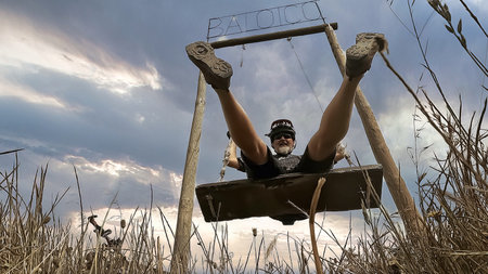 A man is swinging on a swing in the field. He is wearing a helmet and sunglasses.