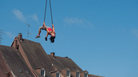 MULHOUSE - France - 11 July 2017 - Portrait of a young women training on trapeze for an outdoor aerobatics show in the main place of Mulhouse