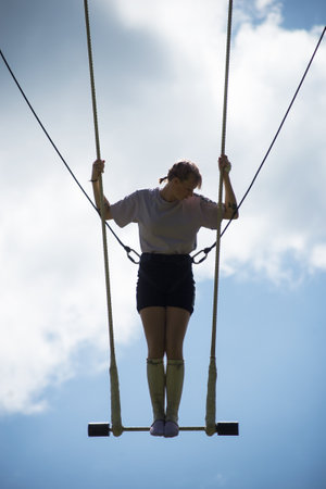 Mulhouse - France - 18 July 2021 - Portrait of girl balancing on trapeze during the street scene festival pn blue cloudy sky background