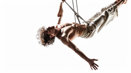 Low angle view of a silhouetted trapeze artist in mid-air. The minimalist, high-key image showcases the performers skill, strength, and the geometric structure of the rig.