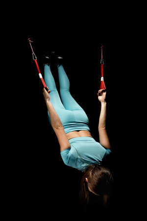Female athletic, sexy and flexible aerial circus artist with redhead on aerial straps on black background