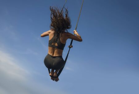 outdoors portrait of young happy and athletic Asian Indonesian woman doing aero yoga workout training body balance and relaxation hanging from swing rope in healthy lifestyle