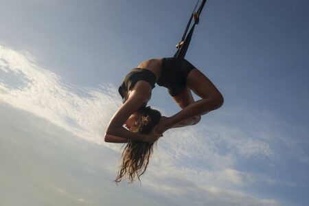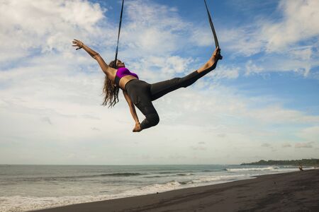 aero yoga beach workout - young attractive and athletic woman practicing aerial yoga exercise training acrobatic body postures on blue sky over sea in Bali island healthy lifestyle concept