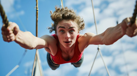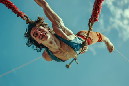 A circus acrobat gracefully performing aerial tricks on a swinging trapeze showcasing agility and skill with a smile
