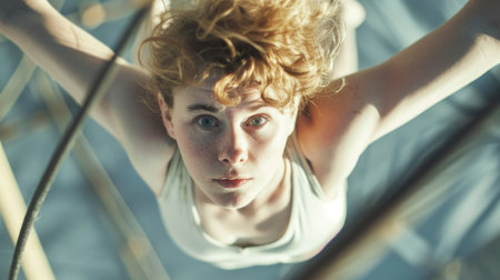 In a serene atmosphere, a focused gymnast gracefully prepares for training on the rings. Sunlight filters through windows, highlighting her strength and determination.