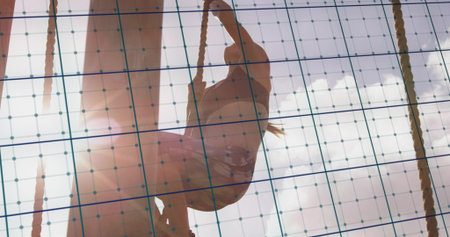 Climbing woman gripping rope on ropes course, wearing sports bra and shorts behind blue gridlines. Outdoor, obstacle, athletic, silhouette, backlit, teamwork, ascent