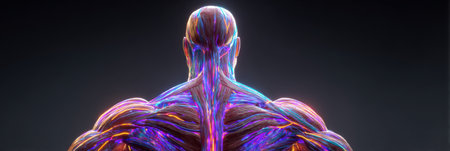 Intricate details showcase a muscular figure from the back, featuring vibrant, glowing lines that emphasize the anatomy, set against a dark backdrop.