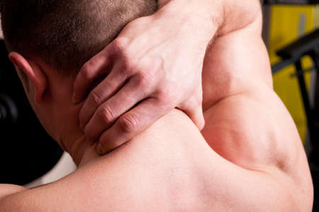 Young muscular fit man touching and grabbing neck and upper back suffering cervical pain after workout. Isolated on neutral background. In sport injury Incorrect posture problems and body health care.