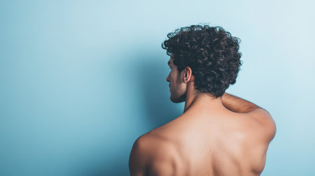 A young man with curly hair stands with his back to the camera showcasing a relaxed posture against a soft blue wall.