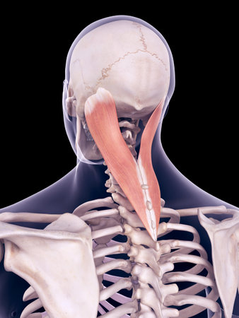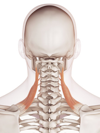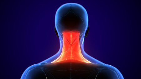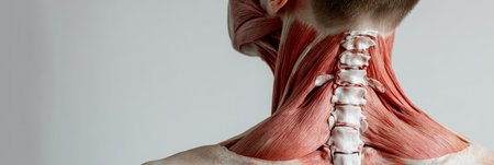 Explore the human necks intricate details with this anatomical model, focusing on muscles and spine. Perfect for medical contexts, offering a close up view of the cervical vertebrae