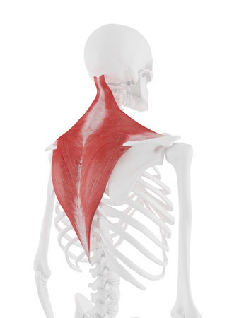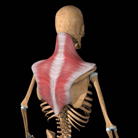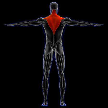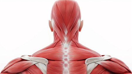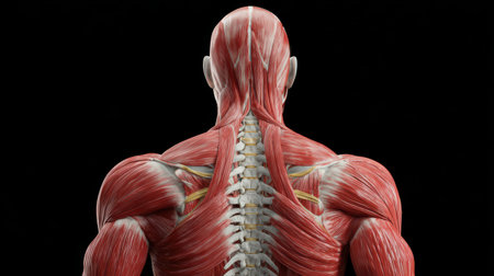 Detailed Illustration of Human Muscular System from Back View with Visible Anatomy of Spine and Muscles Highlighted for Educational Purposes