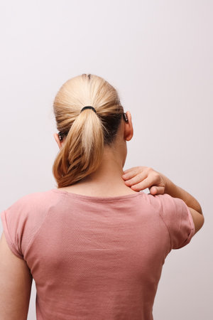 Woman rubbing sore neck. Back view of unrecognizable woman touching and massaging her neck. Pain in the neck.