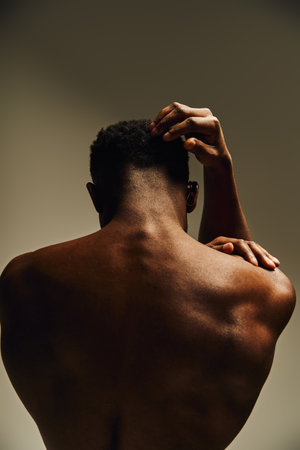 A young African American man stands confidently, showcasing his toned physique. His hands rest on his neck, creating a striking and intimate atmosphere. Soft lighting enhances the mood.