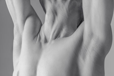 Dark close up studio shoot of strong masculine athletic man. Upper torso and chest. Black and white photo.