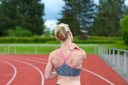 Rear view of athletic female sprinter massaging her own neck at race track with trees in background