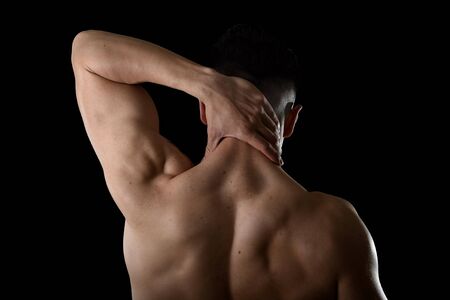 back of young muscular sport man holding sore neck with his hand and touching or massaging cervical area suffering body pain in spine back health problem isolated on black background