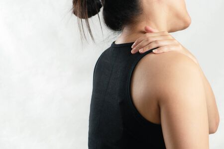 Young man with shoulder pain, massaging his neck. Health problem concept. Isolated on neutral background