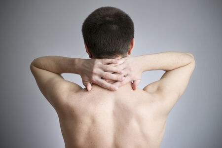 The muscles of the neck in a man on a white background are hurt ache hurt muscle, cramp spine caucasian massage illness expression. Tension therapy, lower suffer attractive