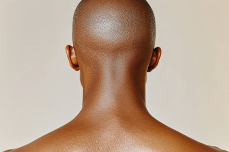 Close up of a bald Black man s neck and shoulders against a soft beige background, celebrating natural beauty and confidence in self expression