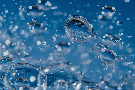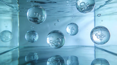 This image features a collection of floating bubbles in clear water, illuminated by soft light against a serene blue backdrop, creating a calming effect.