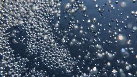 Underwater bubbles in blue water. Underwater background with air bubbles.