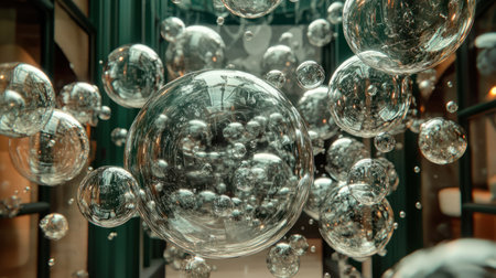 A high-concept visualization of stock market bubbles, depicted as delicate glass spheres