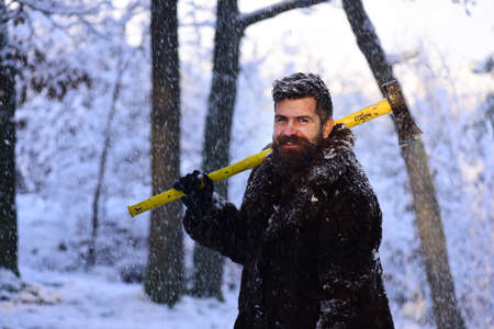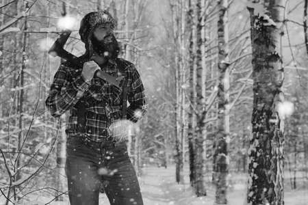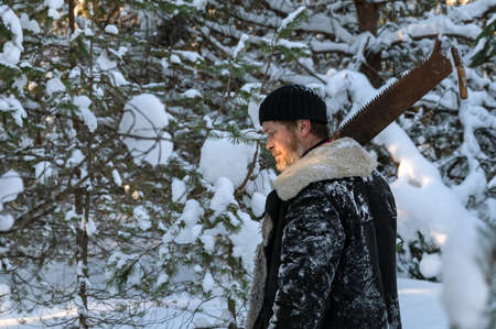 Portrait of serious brutal man with beard and in warm sheepskin coat in the middle of snowy forest. Man holds hand saw on his shoulder. Life away from civilization. copy space