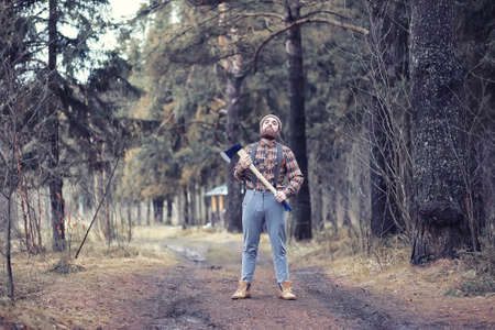 Beautiful woodcutter with an ax in the forest. Bearded handsome man