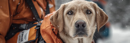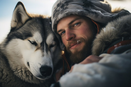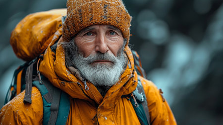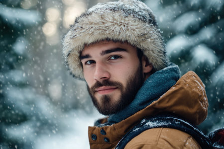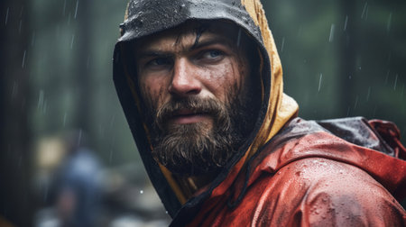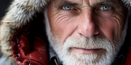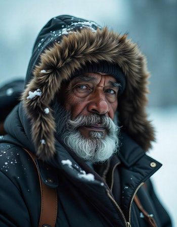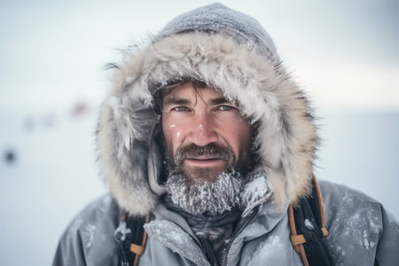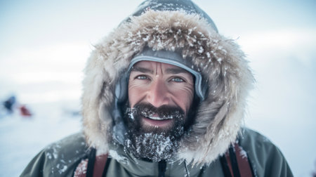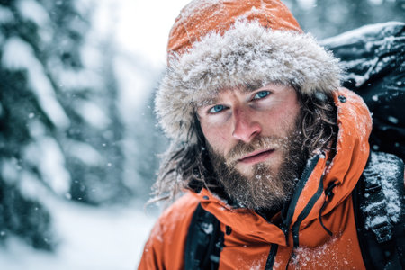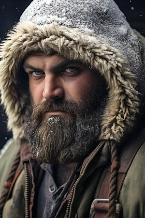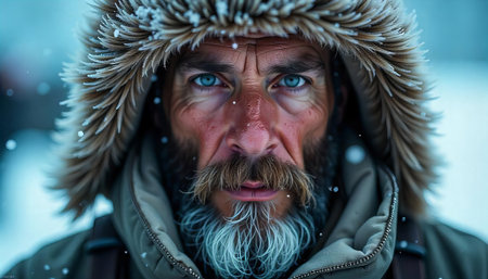 Determined middle-aged caucasian man braving harsh winter conditions in snowy snowstorm. Showcasing his rugged. Snow-covered beard and intense gaze while wearing winter clothing with fur hood