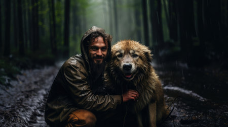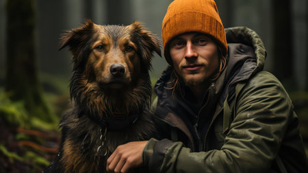 Portrait of a man with a dog in a forest. The concept of protecting animals.