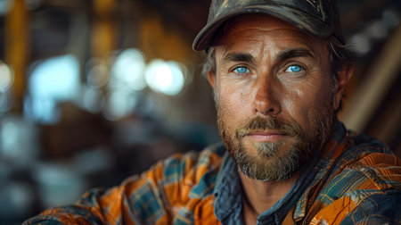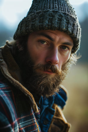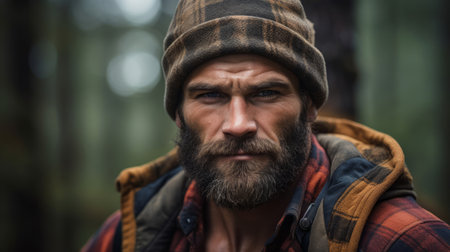 Close-up of bearded lumberjack plaid shirt leather hat forest