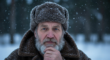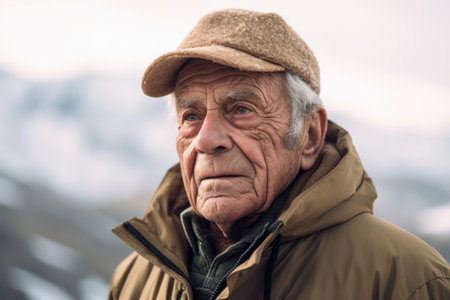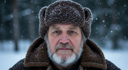 Portrait of an elderly man with hat and jacket outdoors in winter