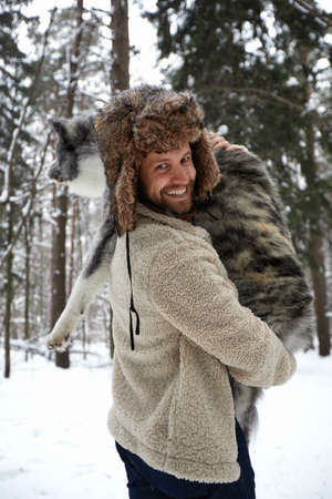 Men playing with siberian husky in winter forest and park, animals and ecology