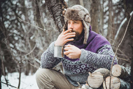 Bearded man drinking tea in the forest. Bearded woodcutter at rest in winter.