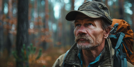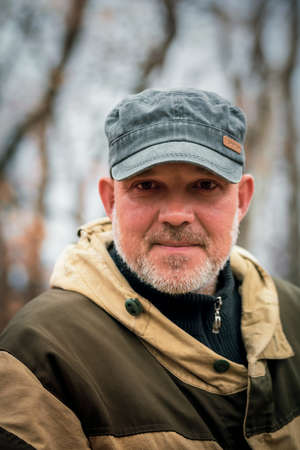 Portrait of a Smiling Man 40-45 years old in a Baseball Cap and warm Camouflage Seasonal Outerwear for Outdoor Activities Close-up in Autumn on the Background of the Forest in Nature