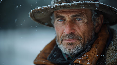 A close up portrait of a man with piercing blue eyes and a thick fur hood, evoking the harshness of winter. His weathered face and icy gaze contrast with the soft, snowy particles clinging to his beard and hood. The background is blurred, focusing attention on his intense expression, symbolizing resilience in cold, rugged conditions.
