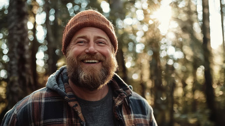 A cheerful man with a beard wearing a plaid jacket and beanie stands amidst tall trees, smiling warmly at the camera as sunlight filters through the forest at dawn.