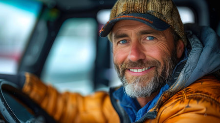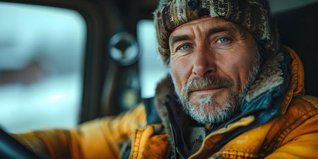 Middleaged truck driver in casual attire driving a truck on a long transportation route. Concept Trucker's Lifestyle, Long Haul Drives, On the Road Again, Transportation Routes, Casual Attire