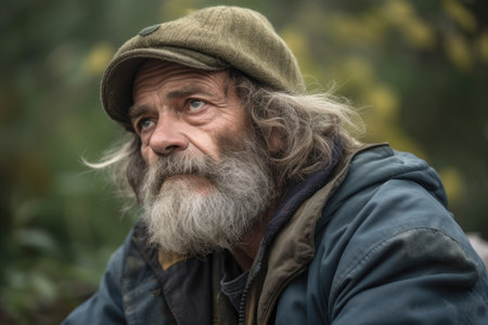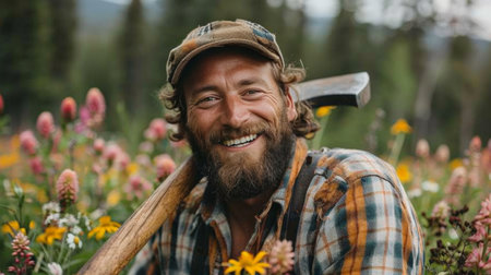 A seasoned lumberjack reflects deeply amid greenery, showing the strength of his character and hard work.